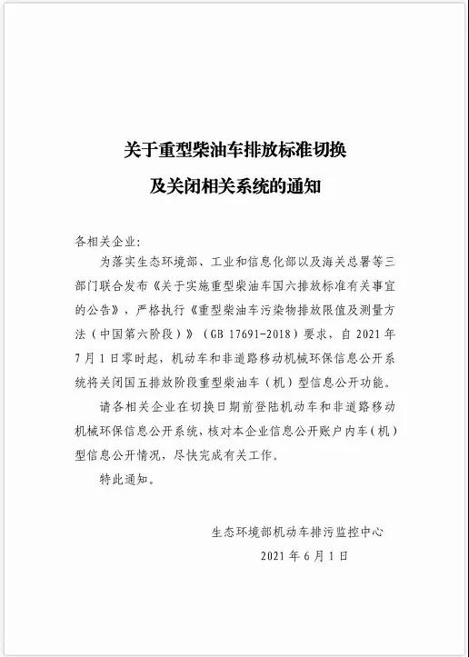 • 為落實(shí)生態(tài)環(huán)境部、工業(yè)和信息部以及海關(guān)總署等三部門聯(lián)合發(fā)《關(guān)于實(shí)施重型柴油車國六排放標(biāo)準(zhǔn)有關(guān)事宜的公告》,嚴(yán)格執(zhí)行《重型柴油車國六排放標(biāo)準(zhǔn)有關(guān)事宜的公告》,嚴(yán)格執(zhí)行《重型柴油車污染物排放限值及測(cè)量方法(中國第六階段)》(GB 17691-2018)要求,自2021年7月1日零時(shí)起,機(jī)動(dòng)車和非道路移動(dòng)機(jī)械環(huán)保信息公開系統(tǒng)將關(guān)閉國五排放階段重型柴油機(jī)車(機(jī))型信息公開功能。